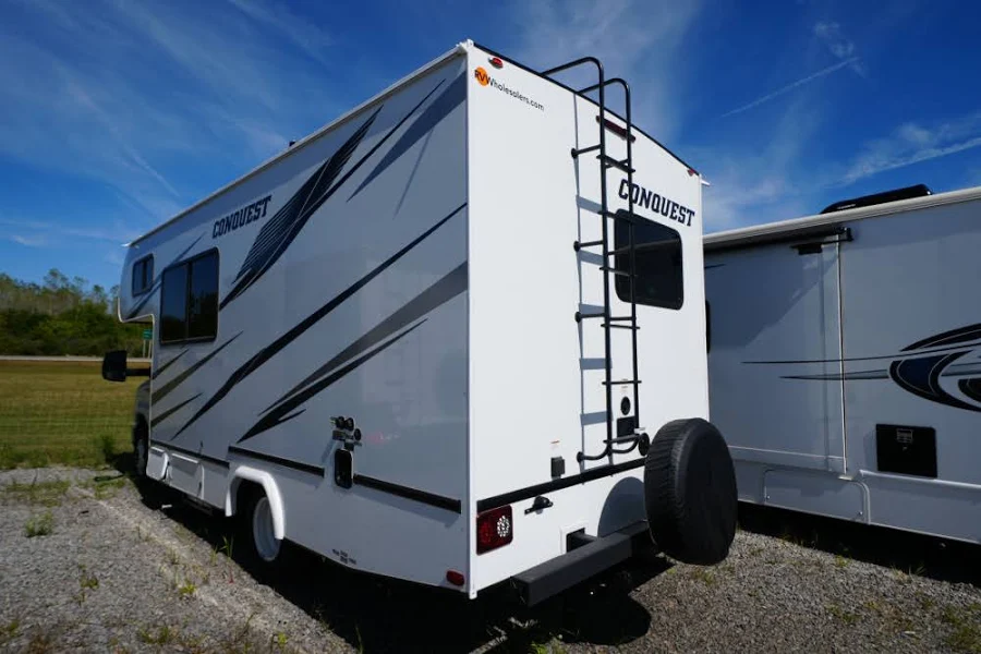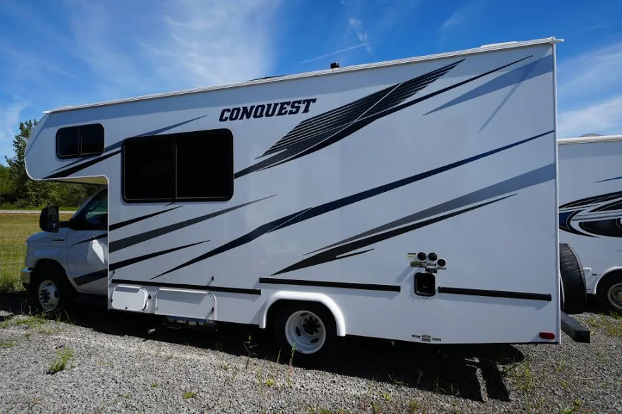 • Conquest Luxury Package: 4.0 Onan Generator – Enclosed | Electric Awning with LED Lights & Speakers | 13,500 BTU Roof Air Conditioner | AM/FM/CD Radio with Built in Monitor/ Back Up Camera | All Stainless Steel Appliance Package | High Gloss White Fiberglass Ext Sidewalls with Azdel | Upgraded LED Lighting Interior & Exterior | Exterior Acrylic Grab Handle | Range Cover | Friction Hinge Entry Door with Shade | Designer Graphics | Ducted Roof Air Conditioner | Ceiling Light Wall Switch at Entry Door | Linoleum Throughout | IRD Dual Battery Charging System | Emergency Start Switch | Deluxe Comfort Mattress | Stainless Steel Wheel Liners | Outside Shower | Black Tank Flush