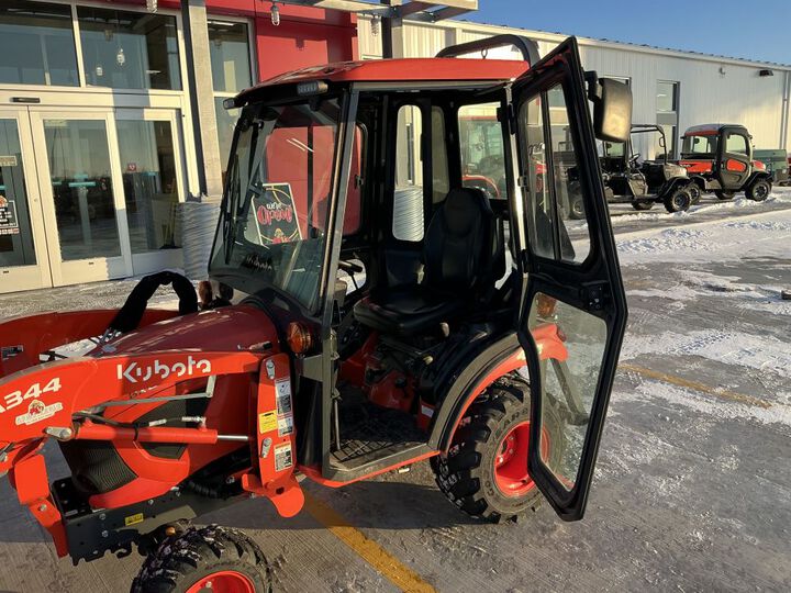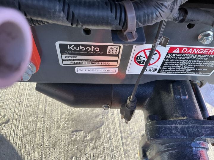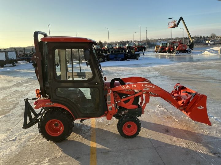 This USED 2023 Kubota (BX2680V-1) sub-compact utility tractor is powered by a 24.8 HP Kubota D722 diesel engine. It also features the following equipment additions and accessories: 4WD (4-wheel-drive), a factory cab with a heater, front and rear wipers, front and rear LED work lights, headlights, taillights, amber safety flashers, a block heater, a hydrostatic transmission, a locking rear differential, and a grill guard. It comes equipped with a Kubota LA344 front loader featuring a two-level manual quick-attach system and a 48-inch bucket, along with a 3-point receiver hitch, mid and rear PTOs, and R14 crossover tires. Kubota’s BX Series sub-compact tractors are built for reliability, comfort, and versatility. The BX2680V-1 is made to efficiently handle a wide range of tasks, including gardening, landscaping, and general property maintenance, making it an excellent solution for both homeowners and professionals.